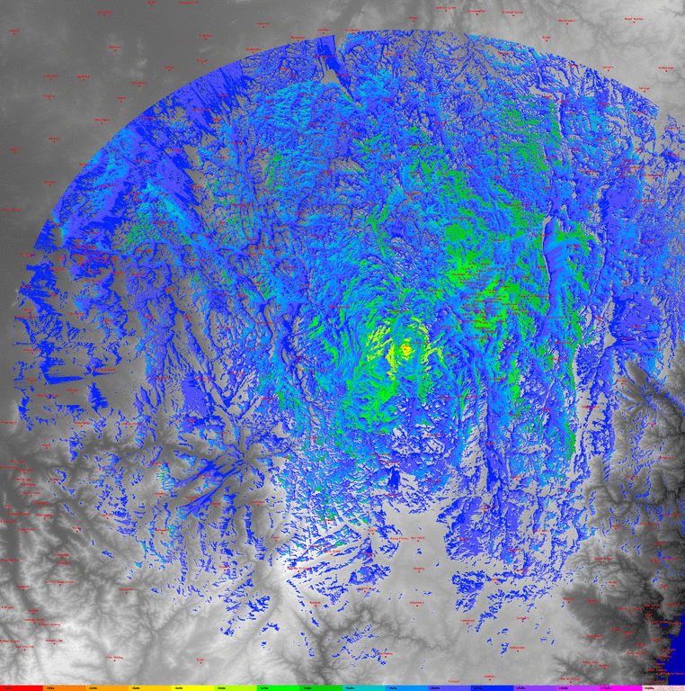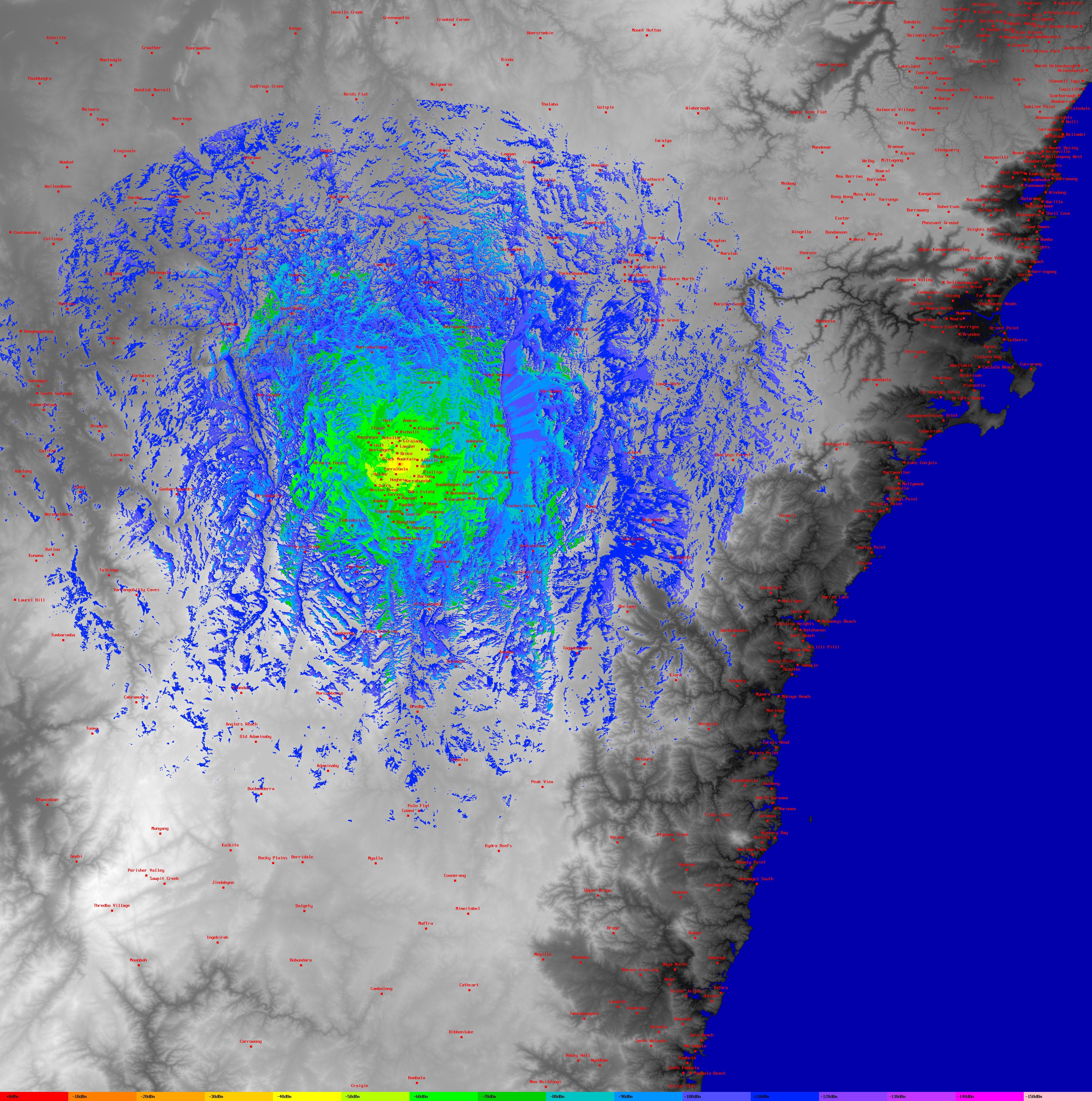 These stripped down plots contain the signal strength data only and are missing place names and topographical features. They are designed to be overlaid, via the KML file onto the maps in Google Earth. If you tilt the display, you can see the coverage painted on the sides of the hills!